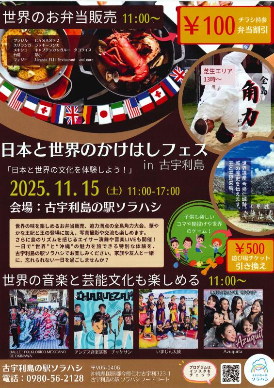 11月15日(土)古宇利島の駅ソラハシにて世界の味を楽しめるお弁当販売、迫力満点の全島角力大会、華やかな王妃と王の登場に加え、写真撮影や交流も楽しめます★家族や友人と一緒に、忘れられない一日を過ごしませんか?詳細はパンフレットをご覧ください。日程:2025.11.15(土)11:00-17:00会場:古宇利島の駅ソラハシ