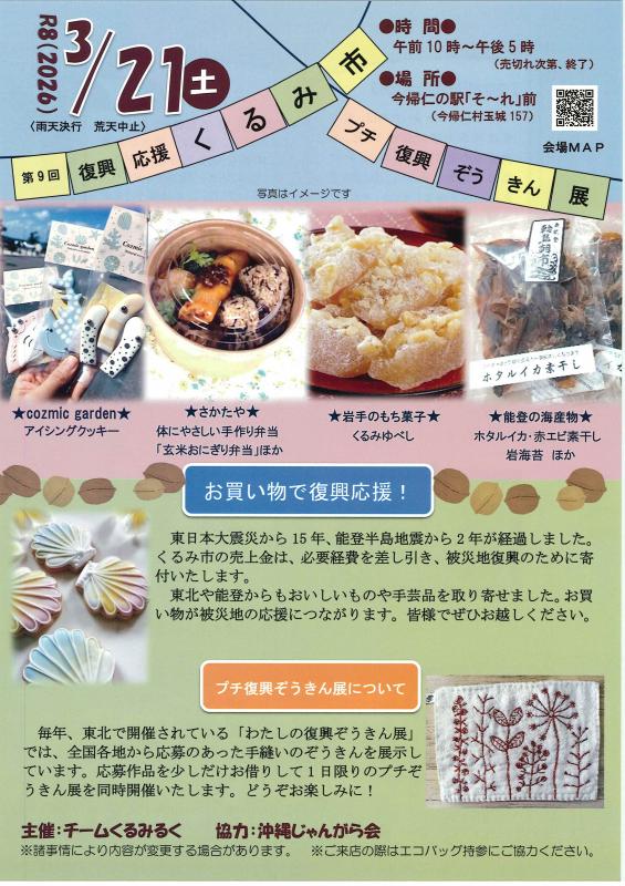 第9回 復興応援~くるみ市~【日付】2026年3月21日(土)【場所】今帰仁の駅そーれ前【時間】午前10時~午後5時(売れ切れ次第終了)東日本大震災から15年、能登半島地震から2年が経過しました。くるみ市の売上金は、必要経費を差し引き、被災地復興のために寄附いたします。東北や能登からもおいしいものや手芸品を取り寄せました。お買い物が被災地の応援に繋がります。皆様でぜひお越しください。