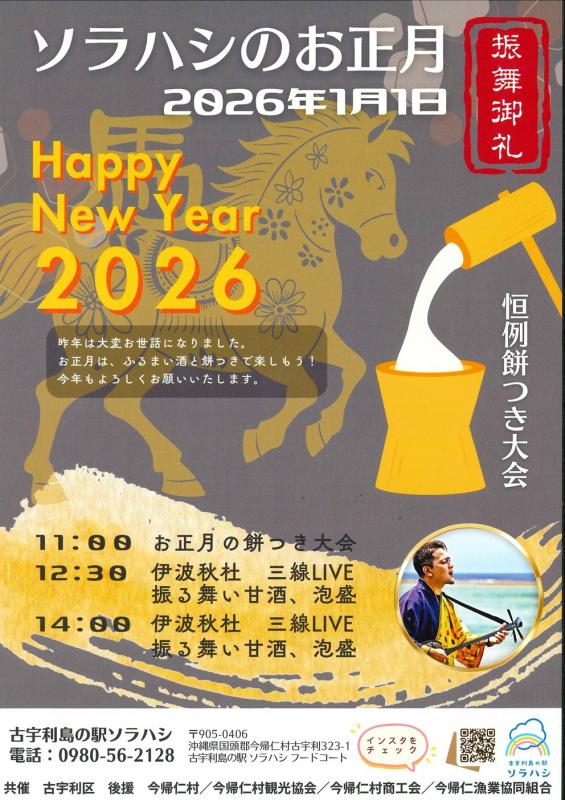 みなさま、2026年1月1日元旦はどうお過ごしでしょうか。古宇利島のソラハシで五感で味わうお正月はいかがでしょうか。2026年1月1日の11時から古宇利島の駅ソラハシで恒例の餅つき大会がございます。12時30分からは、伊波秋杜さんの三線LIVE。さらに振る舞い甘酒、泡盛もお楽しみいただけます。踊る人たちを見て視覚で楽しみ、三線の音色に酔いしれ、目の前にある海の香りに包まれて、美味しい泡盛や甘酒を舌...